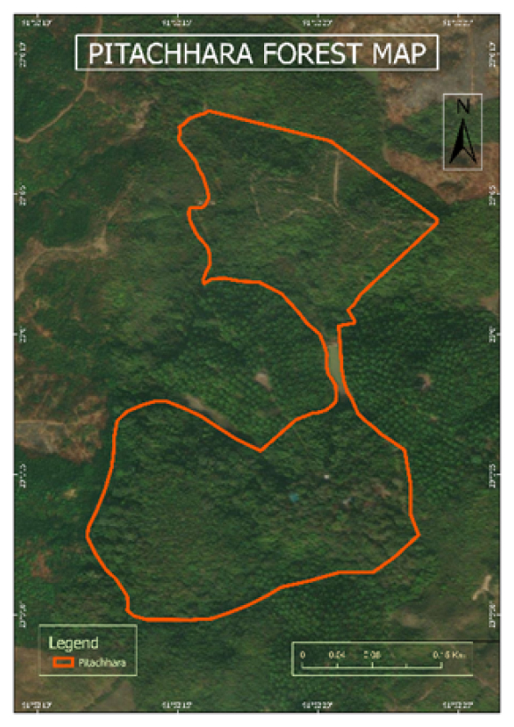Pittachhara Forest is a small 23 acre (9.31 ha) private forest at East Khedachara village in Belchhari Union of Matiranga Upazila in Khagrachari Hill District, about 18 km from Matiranga Proper, at 23.0983430N latitude and 91.8718910E longitude. The site has a clear boundary demarcated by boundary pillars and stream pathways. While most of the surrounding forests have been deforested and converted into oil palm, teak and cassava farming, agricultural fields, human settlements, and other uses, the Pittachhara forest has been restored through protection, assisted natural regeneration and enrichment planting of local tree species. It is now well conserved and contains most of the typical plants and animals of the semi-evergreen tropical hill forests of south-eastern Bangladesh – a part of the globally famous Indo-Burma biodiversity hotspot.